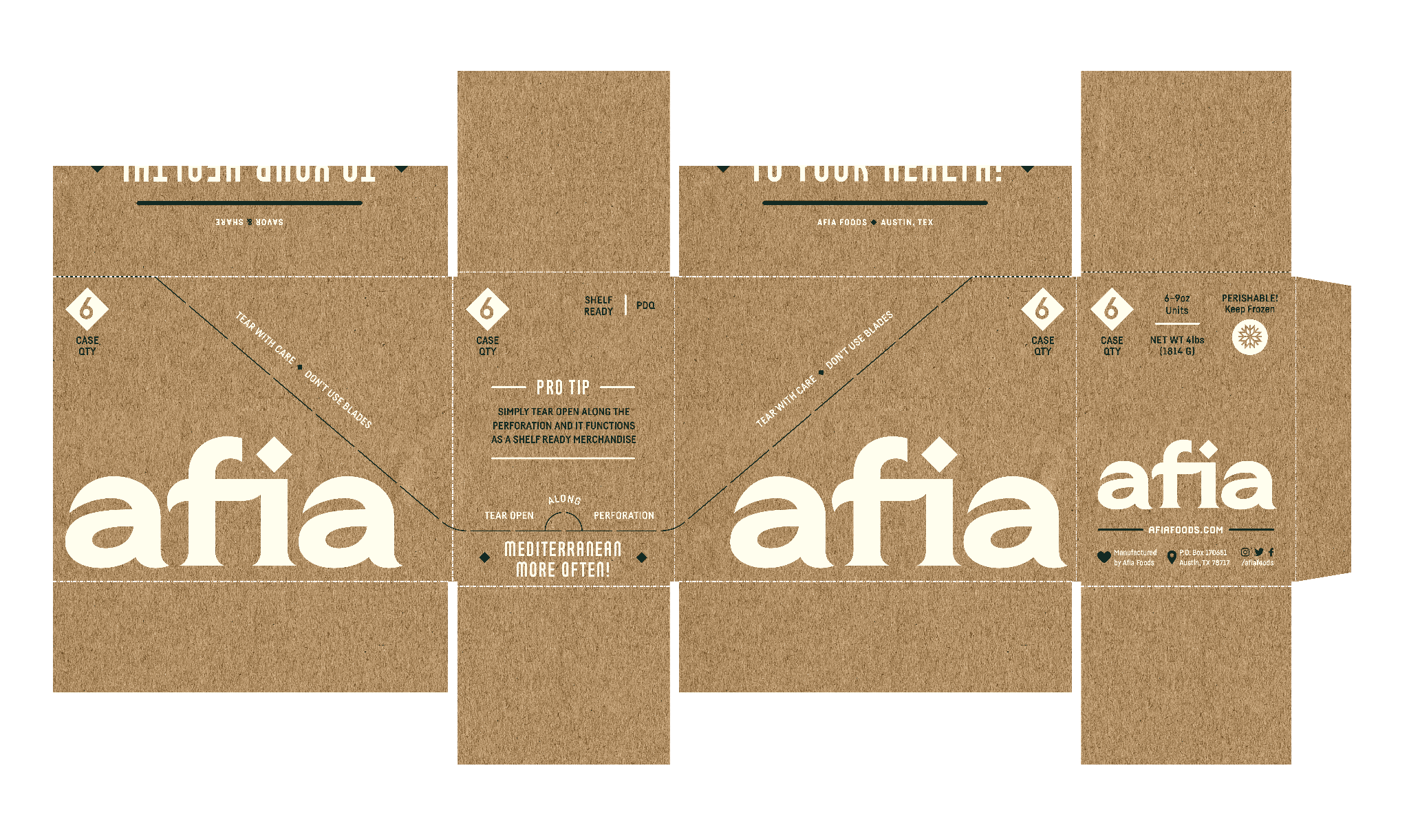 Afia is a local Austin favorite in the frozen food aisle looking to serve a national audience while honoring its rich heritage. The team at Preacher vowed to move the idea of Mediterranean culture and cuisine from an infrequent novelty to something incorporated into their lives. Mediterranean More Often, a fresh visual identity, full packaging redesign, host of new merch, and platform idea that made Afia a passport to cuisine and community.