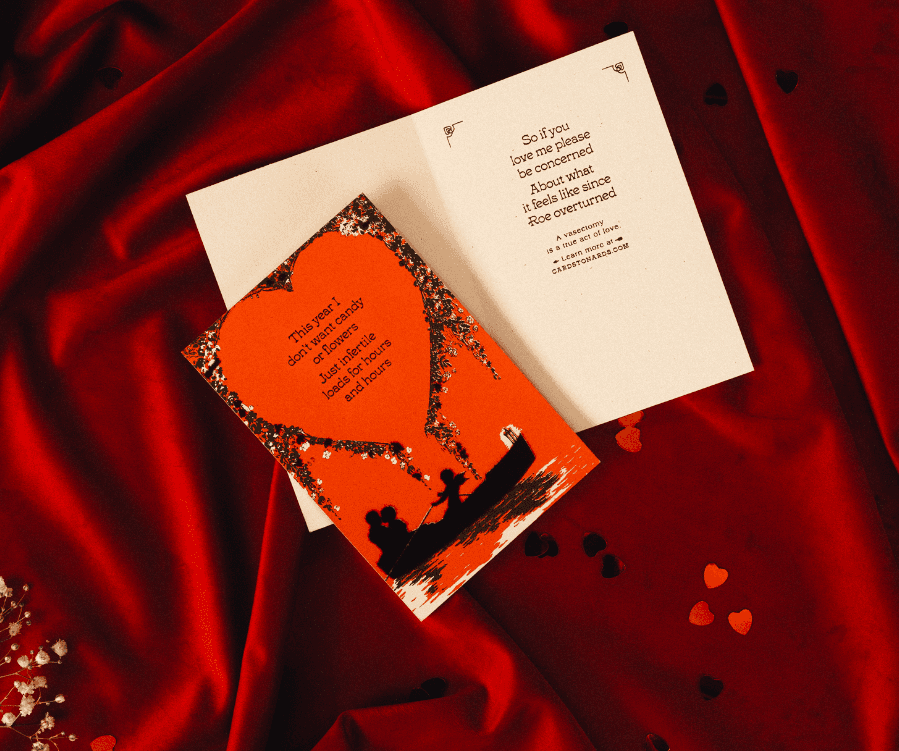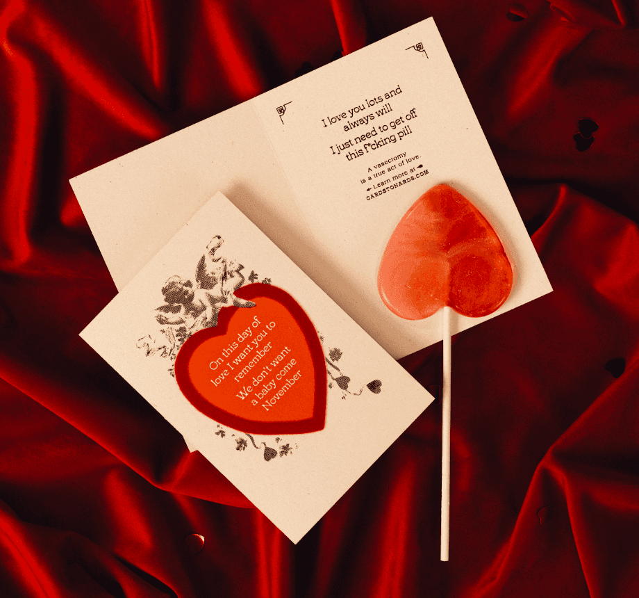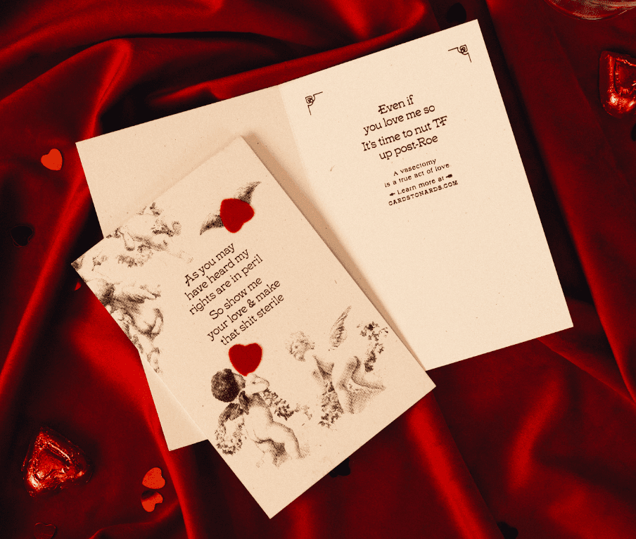 Following the overturn of Roe v. Wade, we partnered with World Vasectomy Day to create Cards for Nards—a cheeky Valentine’s campaign encouraging men to consider the ultimate act of love: getting a vasectomy. We took inspiration from flirty, flocked ’70s Valentine’s cards and steered the art direction toward that retro romantic feel, working closely with Tombras’ team to perfect the textures and tones. To top it off, we designed custom upside-down heart lollipops—because, let’s be honest, they looked a little more like nards that way.