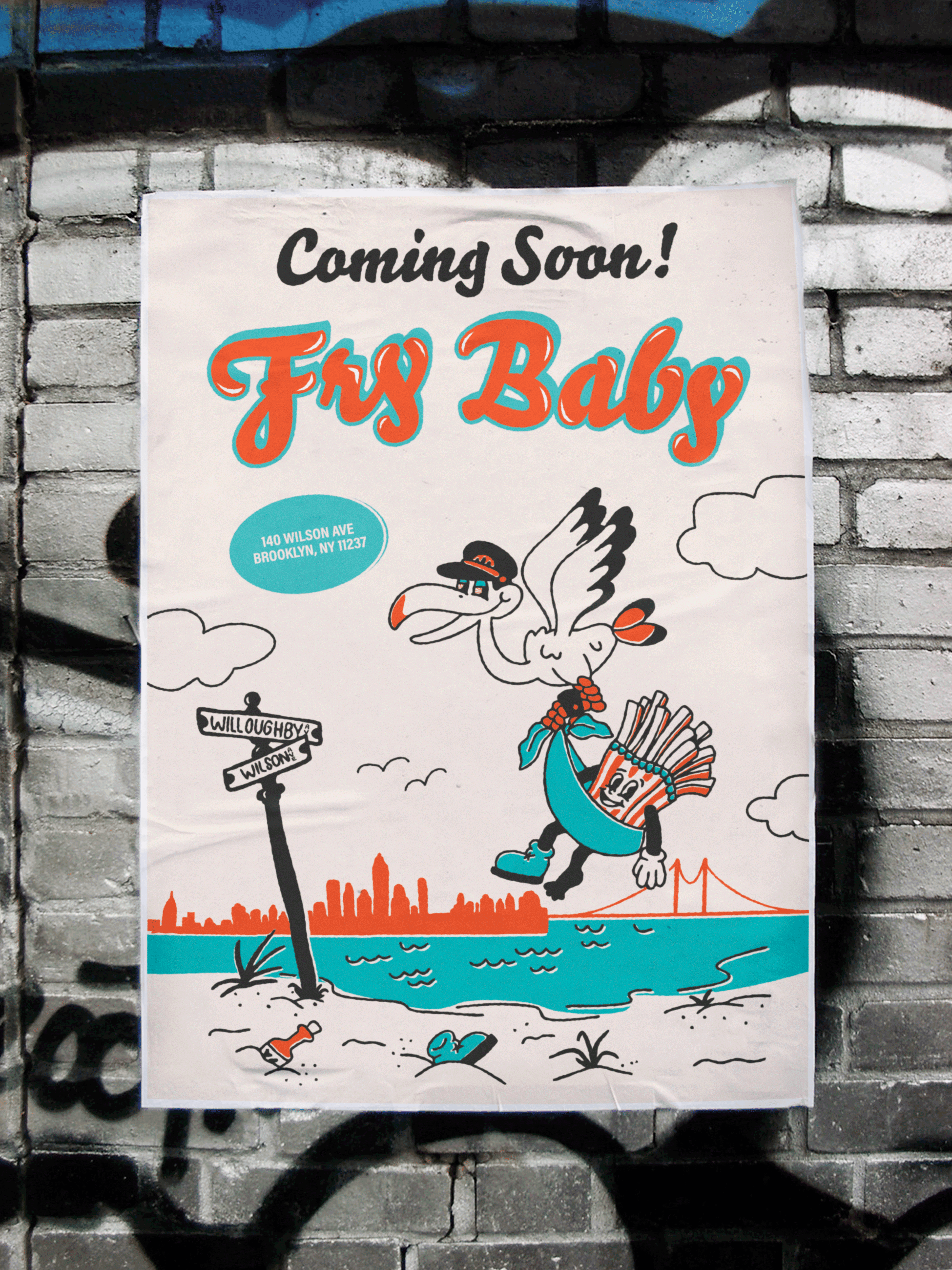 We designed and illustrated Fry Baby, a beach-born fried chicken concept by my cousin, Chef Clarke Bliss, and Chef Ben Tomaiuolo. Taking a new brand fom concept to reality, particularly for a restaurant that is personally meaningful to me, has been a delicious ride. We designed and illustrated every component and detail of this brand with these collaborators; every detail—from the storefront to the menus—was a love letter to our boardwalk roots, bringing a bit of the shore to the streets of Brooklyn.
