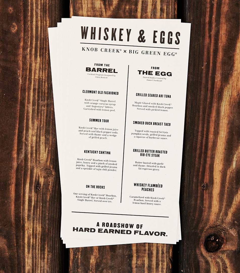 Knob Creek wanted to turn “This Creek Runs Full” into an experience that would immerse our bourbon drinker in our carefully crafted brand world. We created Whiskey and Eggs, a roadshow of hard-earned flavor. Partnering with Big Green Egg, we brought a taste of Clermont, Kentucky to top culinary festivals around the country. Our custom footprint designed with Kartwheel Craftsmanship combined the visual language of the campaign with educational elements from the distillery in a rich indoor/outdoor smokehouse, setting itself apart from the sea of white festival tents. The menu was assembled by some of our culinary heroes, and the custom food and drink pairings elevated Knob Creek’s flavor at every turn. The result? A lot of happy guests, clean plates and empty glasses.